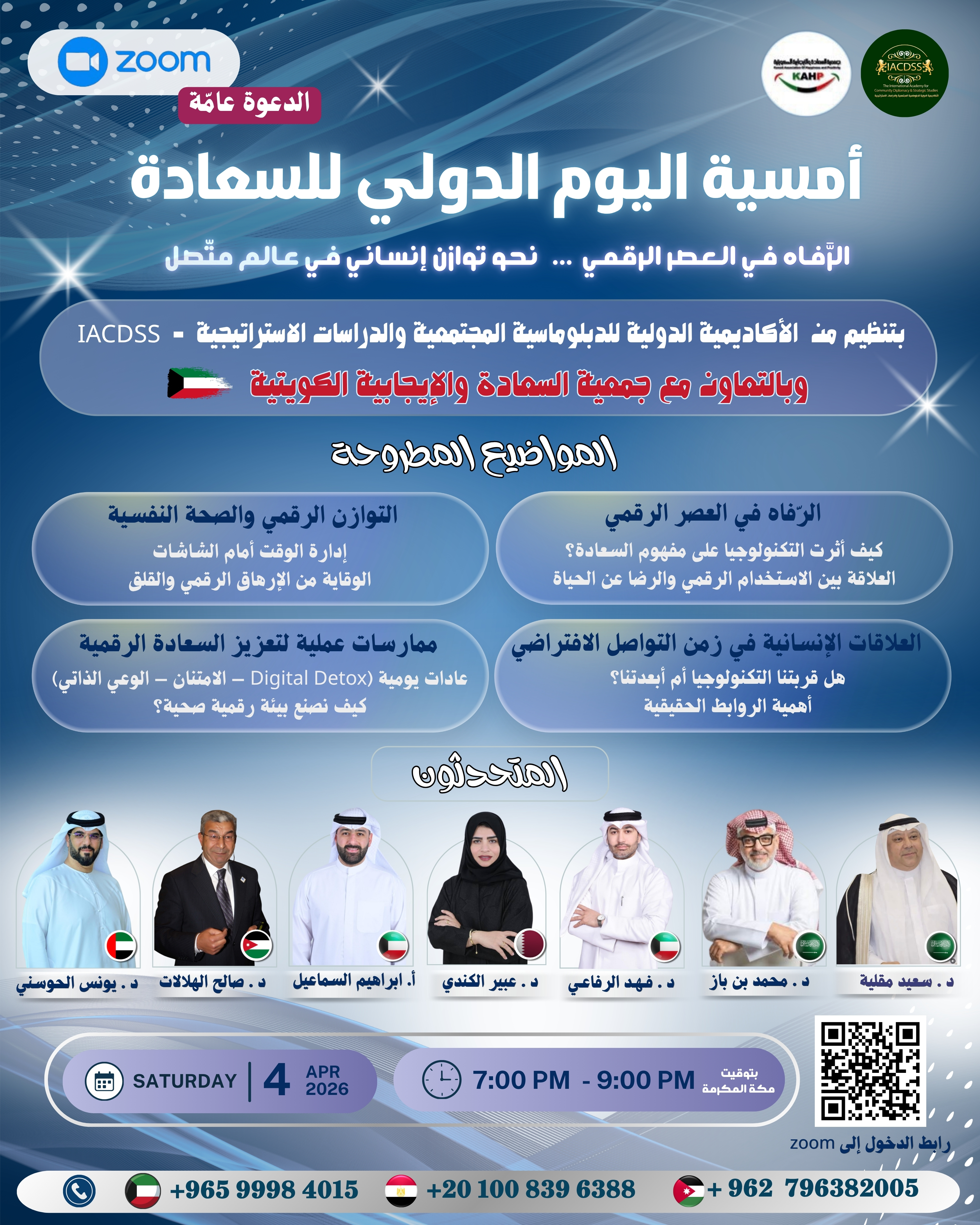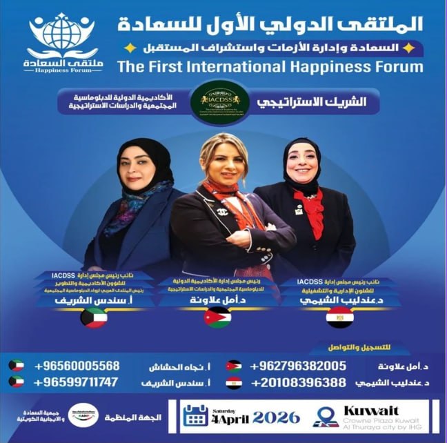 تُعلن الأكاديمية الدولية للدبلوماسية المجتمعية والدراسات الاستراتيجية عن بدء التحضيرات لـ الملتقى الدولي الأول للسعادة، والذي تنظمه جمعية السعادة والإيجابية الكويتية بشراكة استراتيجية مع الأكاديمية، وذلك يوم 4 أبريل 2026 في دولة الكويت.